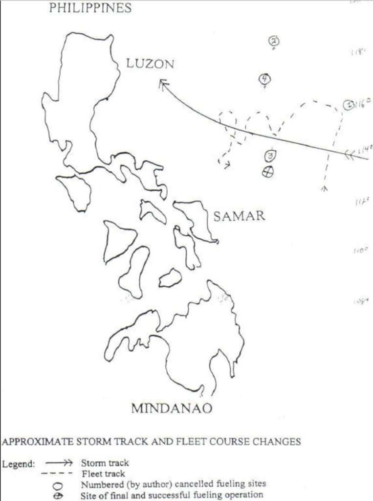 Στις 17 Δεκεμβρίου, ο Halsey σχεδίαζε να εκτελεστούν ανεφοδιασμοί εν πλω περίπου 500 μίλια ανατολικά του Λουζόν, όπου ανέμεναν για αυτό το σκοπό 12 πετρελαιοφόρα. Οι τρεις ημέρες συνεχών επιχειρήσεων είχαν αφήσει πολλά πλοία (κυρίως τα αντιτορπιλικά) επικίνδυνα χαμηλά σε καύσιμα.