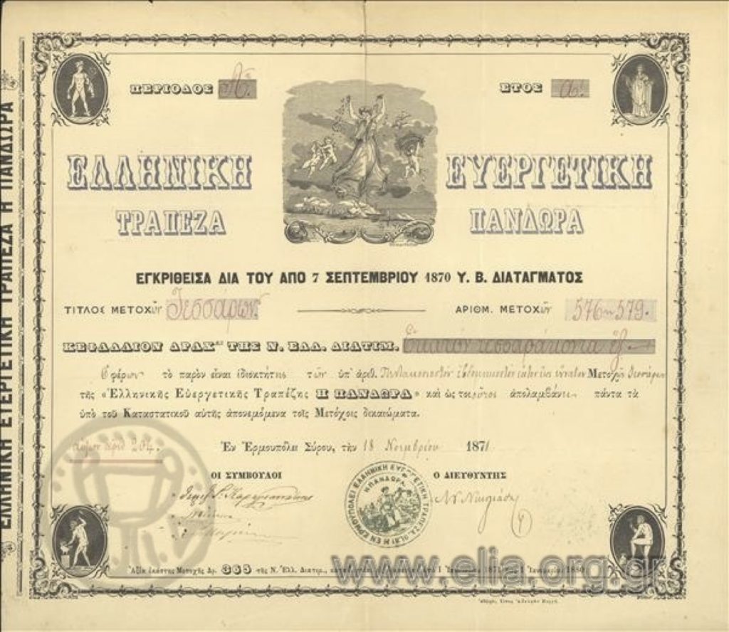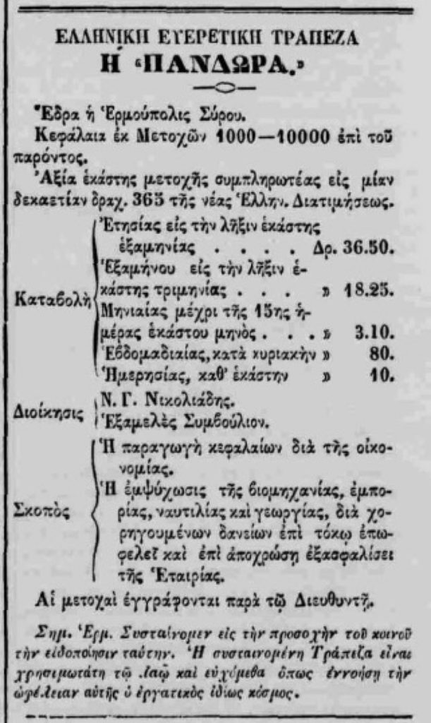 Τον Σεπτέμβριο του 1870, ιδρύθηκε στην Ερμούπολη της Σύρου η “Ελληνική Ευεργετική Τράπεζα η «Πανδώρα» με διακόσιους περίπου μετόχους μεταξύ των οποίων οι ιερατικές και πολιτειακές αρχές της Σύρου, περίπου 10 πλοίαρχοι, ασφαλιστές, έμποροι και απλοί πολίτες. Η εταιρεία ήταν λαϊκής βάσης, λειτούργησε ως συνεταιρισμός με κοινωφελές σκοπό, το δε ιδρυτικό καταστατικό ανέφερε ρητά, ότι σκοπός της τράπεζας θα είναι “η παραγωγή κεφαλαίων δια την οικονομίαν και η διά των κεφαλαίων τούτων εμψύχωσις της βιομηχανίας, εμπορείας, ναυτιλίας” και ότι θα χορηγούνται “Υποθηκοδάνεια” και ”Ναυτικοδάνεια”. Την διεύθυνση της τράπεζας ανέλαβε ο Νικόλαος Γ. Νικολιάδης ( +1879), ο οποίος ήταν συμβολαιογράφος στο επάγγελμα και εκδότης της καθημερινής εφημερίδος “Ημέρα”.