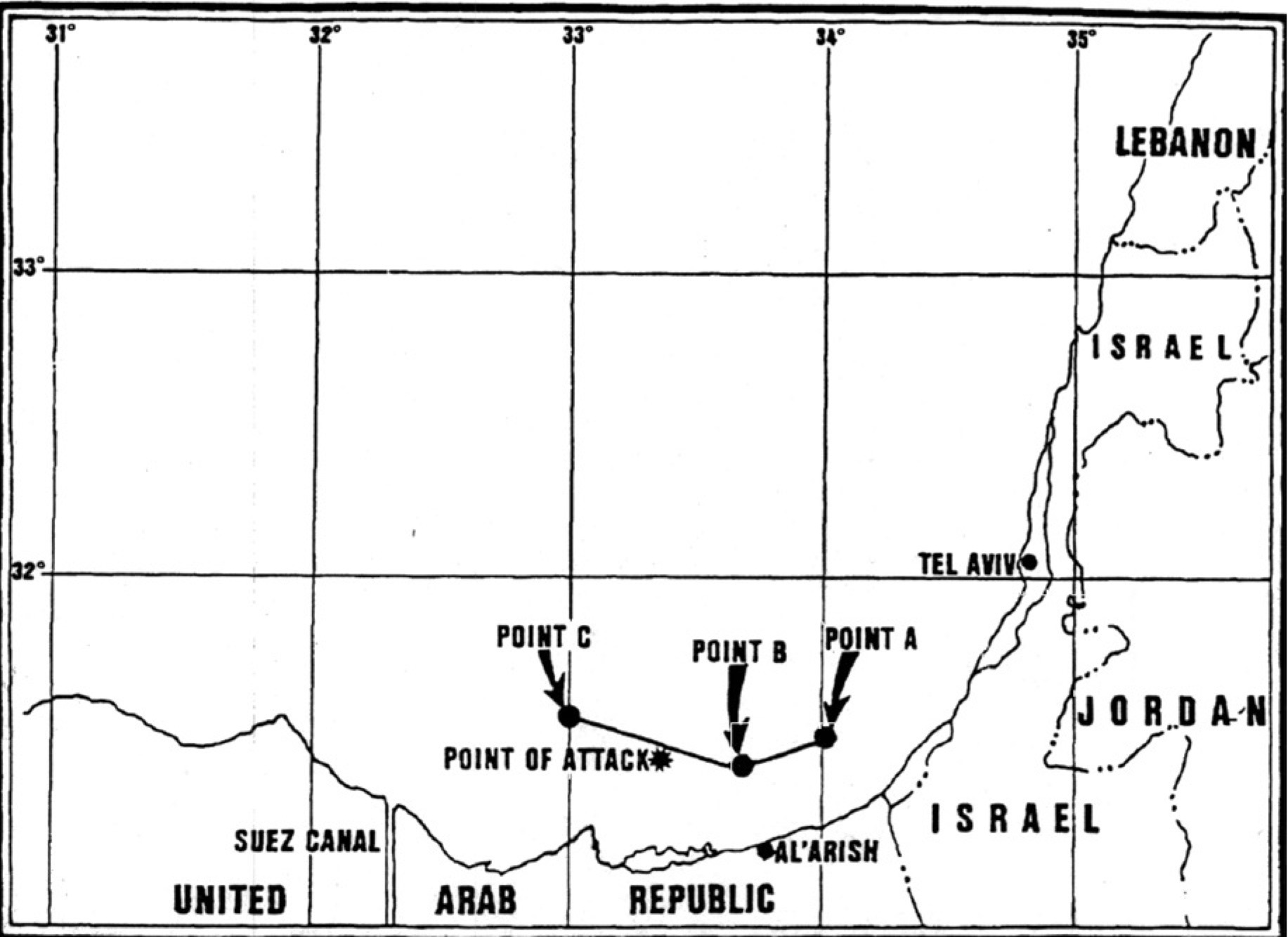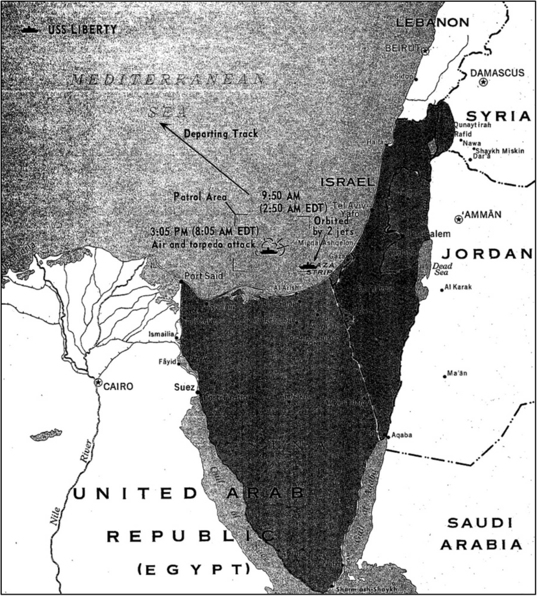 Το πρωινό της 8ης Ιουνίου 1967 ήταν ηλιόλουστο χωρίς νέφωση και με ορατότητα που έφθανε στα 10ν.μ. Η κατάσταση συναγερμού στο πλοίο ήταν η συνήθης ενώ οι εντολές που είχαν δοθεί στην Γέφυρα ήταν να κινηθεί πλησίον των ακτών του Al – Arish στην Αίγυπτο και με ταχύτητα ως 5 κόμβοι για να είναι δυνατή η συλλογή πληροφοριών. Λίγο πριν τις 09:007Όλες οι χρονικές στιγμές που αναφέρονται στο κείμενο είναι σε τοπική ώρα (Local Time) εντοπίσθηκαν δύο δελταπτέρυγα, μαχητικά αεροσκάφη μονής μηχανής σε ύψος 5000 ποδών περίπου και σε απόσταση περίπου 2ν.μ χωρίς να κάνουν κάποια κίνηση προς το πλοίο. Λίγο αργότερα ένα άγνωστο αναγνωριστικό αεροσκάφος 8Από την έρευνα αποκαλύφθηκε ότι ήταν τύπου Noratlas της Ισραηλινής Αεροπορίαςπλησίασε το πλοίο 3-5ν.μ, έκανε μία στροφή από την δεξιά πλευρά του πλοίου και κινήθηκε προς την χερσόνησο του Σινά. Το αεροσκάφος δεν έκανε προσπάθεια να επικοινωνήσει με το πλοίο αλλά ούτε και το αντίστροφο. Ο κυβερνήτης εντόπισε με τα κιάλια του ένα άγνωστο αεροσκάφος περίπου 45°- 50° στην δεξιά πλευρά του πλοίου να κινείται με μεγάλη ταχύτητα και σε απόσταση 5-6ν.μ συνεχώς μειούμενη. Την ίδια στιγμή εμφανίστηκε σε αντίστοιχη απόσταση δεύτερο αεροσκάφος στην αριστερή πλευρά. Ένας εκκωφαντικός κρότος ακούστηκε ξαφνικά. Αμέσως σημάνθηκε «Γενικός Συναγερμός» από τα μεγάφωνα. Από την προσβολή ο κυβερνήτης τραυματίστηκε στο δεξί του πόδι και αιμορραγούσε αλλά παρέμεινε στην Γέφυρα ενώ έδωσε εντολή να εκπεμφθεί άμεσα Επείγον Ναυτικό Σήμα ότι το πλοίο δέχεται επίθεση προς τον 6ο Στόλο (η διοίκηση του ήταν στο αεροπλανοφόρο USS Saratoga – CVA 60).