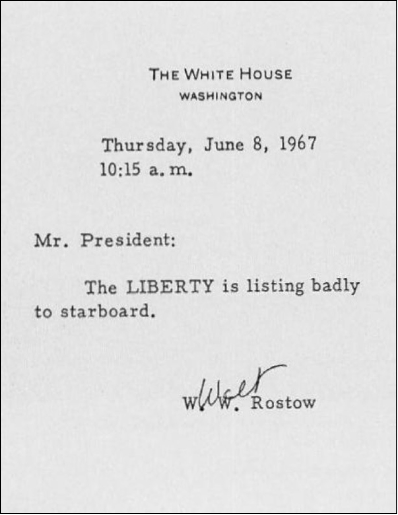 Παρά τη τραγική κατάσταση του πλοίου και ενώ υπάρχουν 34 νεκροί το Αμερικανικό Πεντάγωνο δεν είχε ενημερωθεί άμεσα. Μία ώρα και 11 λεπτά μετά την επίθεση ο CINCEUR ενημέρωσε τα ανώτερα κλιμάκια της αμερικανικής διοίκησης και ζήτησε επίμονα να ενημερωθεί και ο Πρόεδρος Lyndon B. Johnson10Υπήρξε ο 36ος Πρόεδρος των ΗΠΑ https://www.stateoftheunionhistory.com/2015/11/1969-lyndon-b-johnson-un-condemns.html. Αρχικά ενημερώθηκε ο ειδικός σύμβουλος για θέματα ασφαλείας Walt Rostow ο οποίος και ενημέρωσε με την σειρά του τον Πρόεδρο με γραπτό σημείωμα δύο φορές καθόσον υπήρχε σε εξέλιξη συνάντηση με μέλη του Κογκρέσου. Αν και αρχικά επικράτησε σύγχυση για το ποιος έκανε την επίθεση αλλά και προβληματισμός για τυχόν συμμετοχή των Σοβιετικών, ο Αμερικανός Στρατιωτικός ακόλουθος στο Ισραήλ έλαβε την πληροφορία από τους Ισραηλινούς ότι η προσβολή έγινε από λάθος δικό τους και πληροφόρησε άμεσα το Πεντάγωνο. Άμεσα δόθηκε εντολή τα αεροσκάφη που προσέγγιζαν το πλοίο να επιστρέψουν ενώ όλες οι ανακοινώσεις στα ΜΜΕ για το συμβάν θα γίνονταν από το Λευκό Οίκο αποκλειστικά.