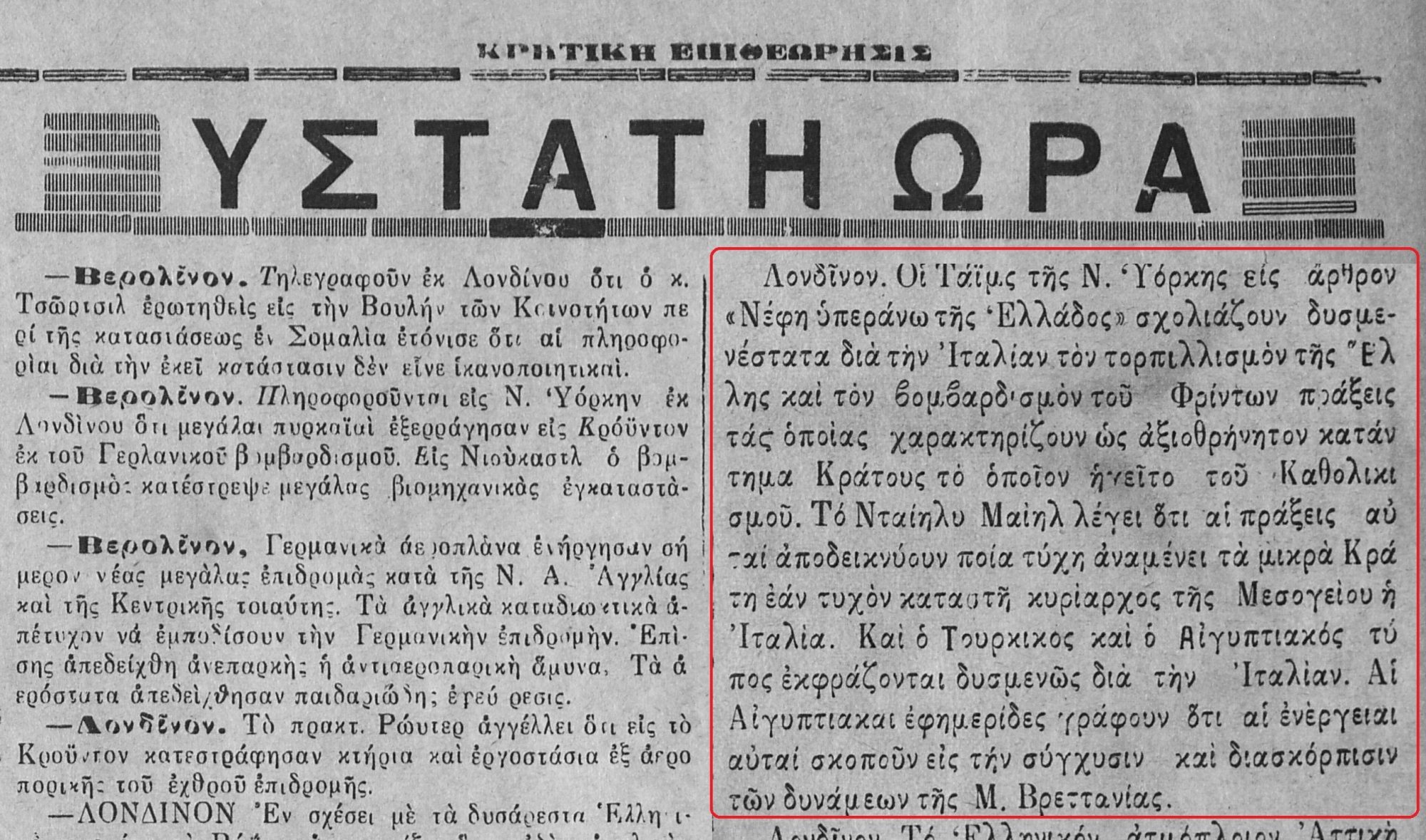 “Οι Τάϊμς της Νέας Υόρκης εἰς ἄρθρον «Νέφη ὑπεράνω τῆς Ἑλλάδος» σχολιάζουν δυσμενέστατα διὰ τὴν Ἰταλίαν τόν τορπιλλισμὸν τῆς Ἕλλης” καὶ τὸν βομβαρδισμόν τοῦ “Φρίντων”, πράξεις τὰς ὁποίας χαρακτηρίζουν ὡς ἀξιοθρήνητον κατάντημα Κράτους τὸ ὁποῖον ἡγεῖτο τοῦ Καθολικισμοῦ. Τὸ “Νταίηλυ Μαίηλ” λέγει ὅτι αἱ πράξεις αὐταὶ ἀποδεικνύουν ποία τύχη ἀναμένει τὰ μικρὰ Κράτη ἐὰν τυχὸν καταστῇ κυρίαρχος τῆς Μεσογείου ἡ Ἰταλία…”