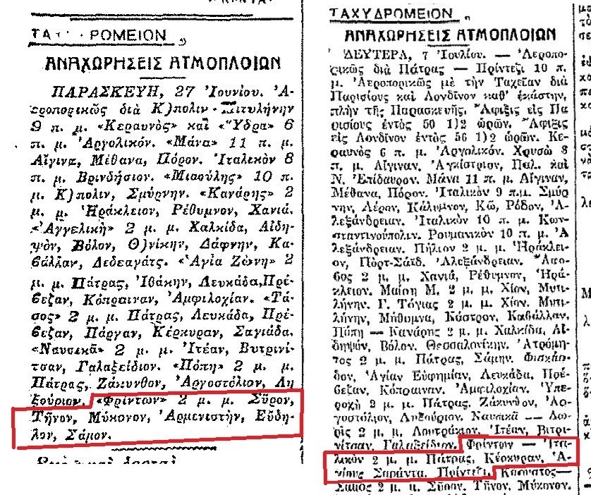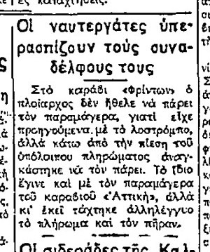 Οὕτω χθὲς τὸ ἀπογευμα τὰ πληρώματα τῶν ἑτοίμων πρὸς ἀναχώρησιν ἀτμοπλοίων “Φρίντων” καὶ “Πόπη”, μὴ λαβόντα την ζητηθεῖσαν παρ΄ αὐτῶν αὔξησιν τοῦ μισθοῦ των, ἐγκατέλειψαν τὰ πλοῖα, κηρύξαντα ἀπεργίαν……