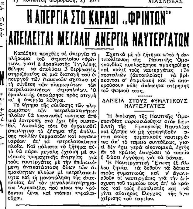 Κατέβηκε προχθὲς σὲ ἀπεργία τὸ πλήρωμα τοῦ ἀτμόπλοιου “Φρίντων”, γιατί ὁ ἐφοπλιστὴς Ἰγγλέσης θέλησε νὰ ἀπολύσει 3 θερμαστὲς στηριζόμενος σὲ μιὰ διαταγὴ τοῦ ὑπουργοῦ τῶν Ναυτικῶν σχετικὰ μὲ τὴν σύνθεση τῶν πληρωμάτων τῶν πετρελαιοκινήτων ἀτμοπλοίων. Ὁ ἐφοπλιστὴς ὑποχώρησε πρὸς στιγμὴ κι΄ ἢ ἀπεργία λύθηκε. Τὸ ζήτημα τῆς σύνθεσης τῶν πληρωμάτων τῶν πετρελαιοκινήτων πλοίων θὰ κανονισθεῖ σύντομα ἀπὸ μιὰ ἐπιτροπή, ποὺ ἔχει ἤδη συσταθεῖ….. (Ριζοσπάστης 17/5/1936).