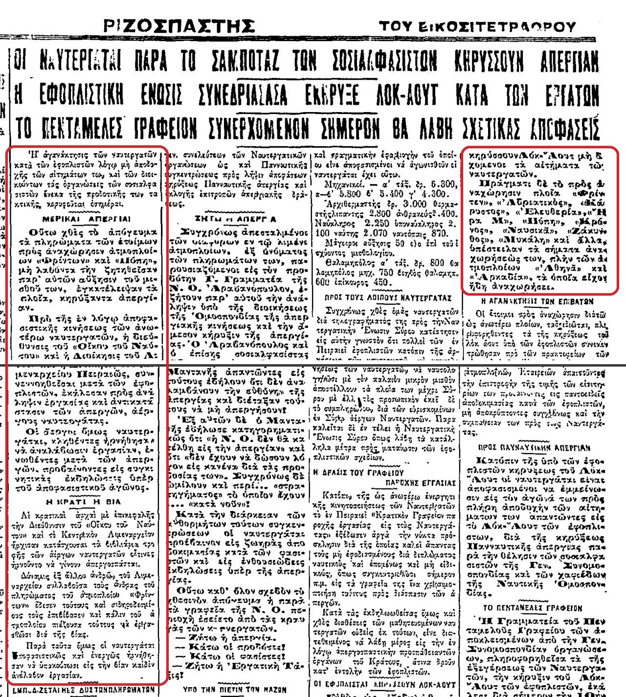 Ἔυθυς ὡς ἐξεδήλωθη ἡ πρὸς ἀπεργίαν αὐθόρμητος κίνησις τῶν ναυτεργατῶν, ἡ Ἐφοπλιστικὴ Ἕνωσις Πειραιῶς συνῆλθεν εἰς μακρὰν συνεδρίασιν διαρκέσασαν μέχρι τῆς 7ης ἑσπερινῆς. Μετὰ τὴν λῆξιν της συνεδρίασιν κηρύσσουν Λόκ-Ἄουτ μὴ δεχόμενοι τὰ αἰτήματα τῶν ναυτεργατῶν. Πράγματι δὲ τὰ πρὸς ἀναχώρησιν πλοῖα “Φρίντων”, “Ἀδριατικός”, “Κάρυστος” καὶ ἄλλα, ὑπέστειλαν τὰ σήματα ἄναχωρήσεώς των…….. (Ριζοσπάστης 3/7/1928).